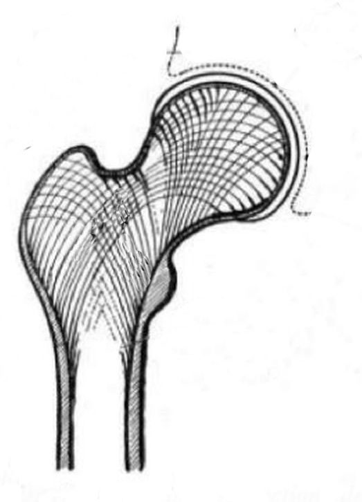 L'os est creux : ce col du fémur montre la trame osseuse en ogives dont la direction dépend des pressions et tractions qui agissent sur l'os . Ces "travées" sont très visibles sur une bonne radio.